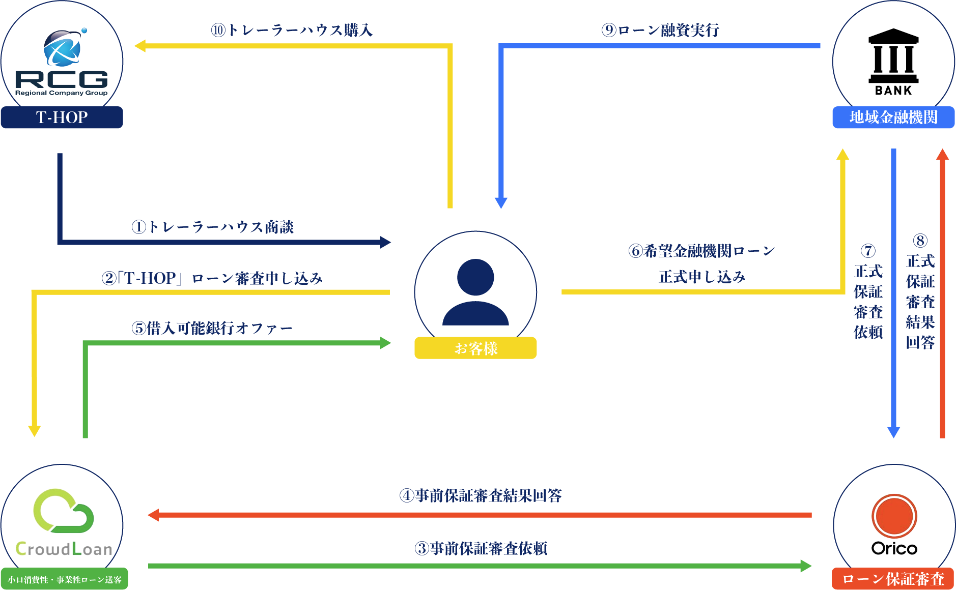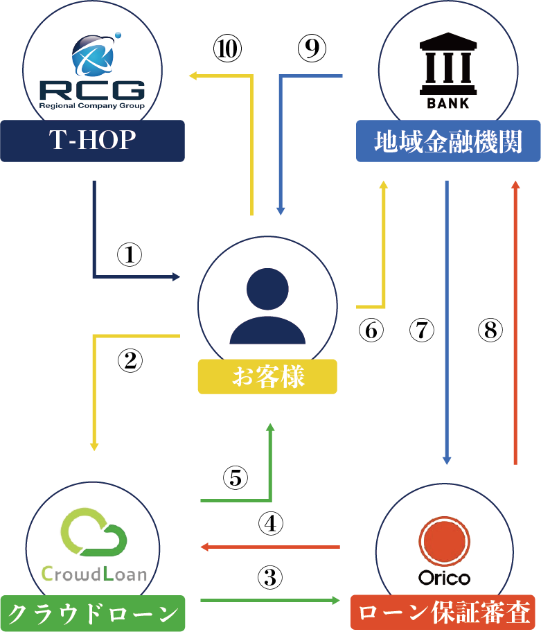 RCGは、お客様の資金手当手段の一つとして、「クラウドローン」(個人ローンを検討するお客様と金融機関を結びつけるプラットフォーム)を紹介し、お客様はこのスキームを介して「T-HOPローン」のお申し込みをすることで、融資のお申し込みから実行までのプロセスをスムーズに進めることができます。オリコは審査・保証ノウハウを活用することで、このスキームを支援いたします。